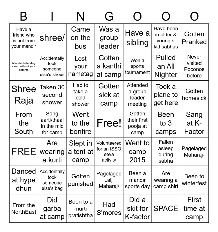 This bingo card has a free space and 53 words: Been to a murti pratishtha, Pulled an All Nighter, From the Midwest, Went to the bonfire, Had to take a cold shower, Pagelaged Maharaj-, shree/, Gadiwala, Have been in older & younger kid sabhas, Danced at hype dhun, Gotten Pranked, Went to camp 2015, Took a plane to get here, Attended a group leader meeting, Are wearing a camp shirt, Gotten homesick, Attended/attending camp without your parents, Never visited Poconos before, Had S’mores, Have a sibling, Won a sports tournament, First time at camp, Accidentally took someone else’s shoes, Have a friend who is not from your mandir, Did a skit for K-factor, From the South, FREE, SPACE, Sang at K-Factor, Lost your nametag, Have a family member currently at camp, Volunteered for an ISSO seva activity, Been a mandir sports day, Been to winterfest, Fallen asleep during sabha, Are wearing a kurti, Was a group leader, Sang aarti/thaal in the mic for camp, Came on the bus, Accidentally took someone else’s bag, Gotten punished, Pagelaged Lalji Maharaj/, Shree Raja, Bought NNDYM merch, From the NorthEast, Gotten sick at camp, Been to 3 camps, Slept in a tent at camp, Gotten a kanthi at camp, Taken 30 second shower, Did garba at camp, Gotten their first pooja at camp and Serve food at your mandir.