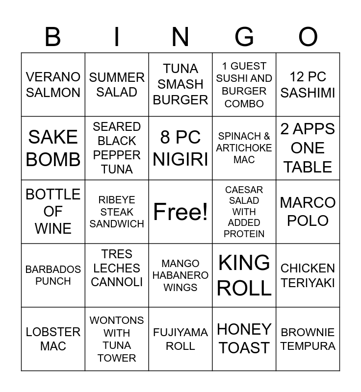 This bingo card has a free space and 24 words: TRES LECHES CANNOLI, WONTONS WITH TUNA TOWER, 8 PC NIGIRI, LOBSTER MAC, 12 PC SASHIMI, VERANO SALMON, SAKE BOMB, SUMMER SALAD, CAESAR SALAD WITH ADDED PROTEIN, MANGO HABANERO WINGS, SPINACH & ARTICHOKE MAC, BOTTLE OF WINE, KING ROLL, CHICKEN TERIYAKI, SEARED BLACK PEPPER TUNA, HONEY TOAST, MARCO POLO, TUNA SMASH BURGER, 2 APPS ONE TABLE, RIBEYE STEAK SANDWICH, BROWNIE TEMPURA, BARBADOS PUNCH, 1 GUEST SUSHI AND BURGER COMBO and FUJIYAMA ROLL.