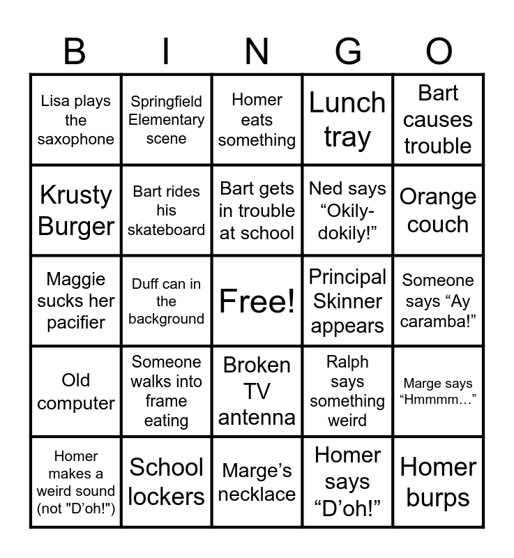 This bingo card has a free space and 24 words: Homer makes a weird sound (not "D’oh!"), Someone walks into frame eating, Bart gets in trouble at school, Homer says “D’oh!”, Bart causes trouble, Lisa plays the saxophone, Springfield Elementary scene, Homer eats something, Principal Skinner appears, Someone says “Ay caramba!”, Maggie sucks her pacifier, Bart rides his skateboard, Ralph says something weird, Marge says “Hmmmm…”, Krusty Burger, School lockers, Marge’s necklace, Lunch tray, Orange couch, Old computer, Duff can in the background, Broken TV antenna, Ned says “Okily-dokily!” and Homer burps.