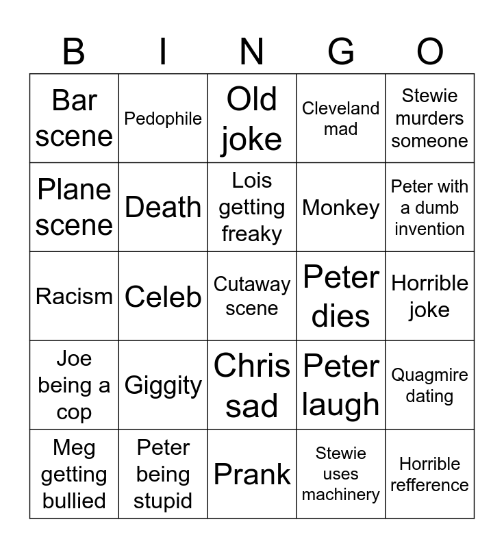 This bingo card has a free space and 24 words: Giggity, Peter being stupid, Lois getting freaky, Meg getting bullied, Stewie murders someone, Bar scene, Plane scene, Pedophile, Peter dies, Chris sad, Monkey, Racism, Peter laugh, Quagmire dating, Death, Stewie uses machinery, Horrible joke, Old joke, Peter with a dumb invention, Celeb, Horrible refference, Joe being a cop, Cleveland mad and Prank.