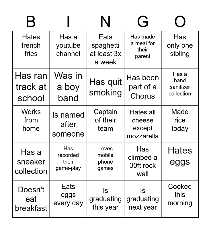 This bingo card has a free space and 29 words: Doesn't eat breakfast, Has a bunk bed, Is named after someone, Has a chore list, Hates french fries, Eats spaghetti at least 3x a week, Was in a boy band, Has recorded their game-play, Hates all cheese except mozzarella, Eats eggs every day, Made rice today, Cooked this morning, Is graduating this year, Is graduating next year, Has a hand sanitizer collection, Learned to play a song on piano by ear, Loves mobile phone games, Has a sneaker collection, Has only one sibling, Works from home, Has climbed a 30ft rock wall, Gets hair cuts at home, Has been part of a Chorus, Has ran track at school, Has made a meal for their parent, Has a youtube channel, Hates eggs, Has quit smoking and Is eating healthier now more than ever.