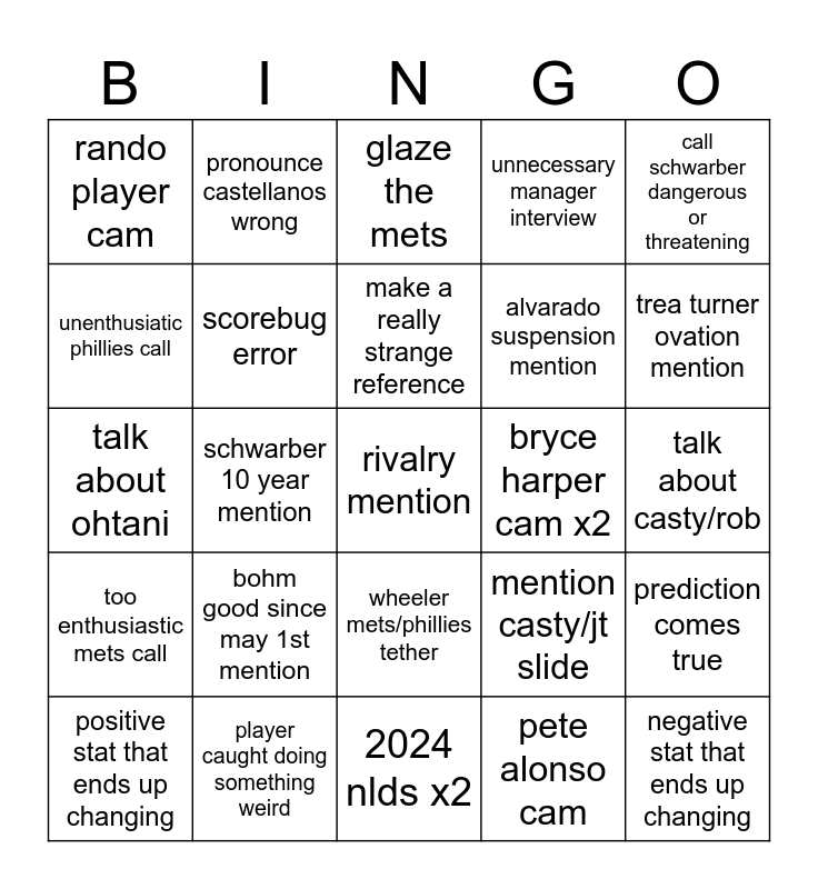 This bingo card has a free space and 24 words: bohm good since may 1st mention, player caught doing something weird, make a really strange reference, positive stat that ends up changing, call schwarber dangerous or threatening, rando player cam, unenthusiatic phillies call, pronounce castellanos wrong, bryce harper cam x2, wheeler mets/phillies tether, alvarado suspension mention, talk about ohtani, mention casty/jt slide, prediction comes true, scorebug error, pete alonso cam, talk about casty/rob, glaze the mets, trea turner ovation mention, schwarber 10 year mention, negative stat that ends up changing, too enthusiastic mets call, unnecessary manager interview and 2024 nlds x2.