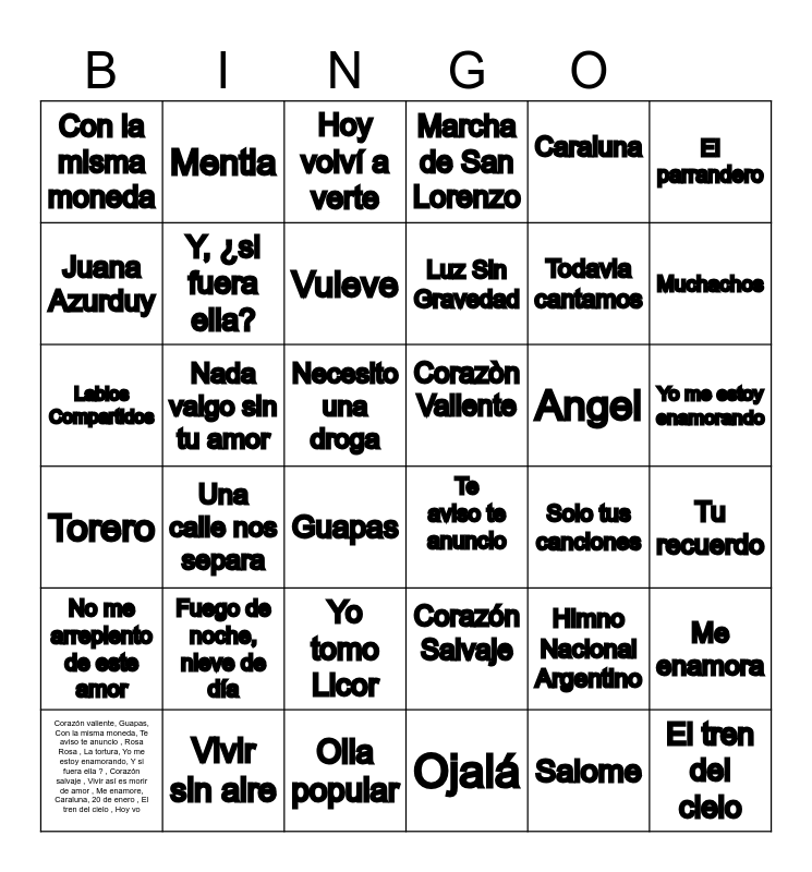 This bingo card has 41 words: Labios Compartidos, Nada valgo sin tu amor, Llamada de emergencia, Marcha de San Lorenzo, Solo tus canciones, Me enamora, Con la misma moneda, La tortura, Hoy volví a verte, Luz Sin Gravedad, Todavia cantamos, Muchachos, Juana Azurduy, Una calle nos separa, Vuleve, Corazòn Valiente, Salome, El parrandero, Torero, Y, ¿si fuera ella?, Necesito una droga, Te aviso te anuncio, Himno Nacional Argentino, Tu recuerdo, No me arrepiento de este amor, Vivir asi es morir de amor, Yo tomo Licor, 20 de Enero, Caraluna, El tren del cielo, Boom Boom, Mentia, Guapas, Corazón Salvaje, Angel, Yo me estoy enamorando, Fuego de noche, nieve de día, Olla popular, Ojalá, Vivir sin aire and Corazón valiente, Guapas, Con la misma moneda, Te aviso te anuncio , Rosa Rosa , La tortura, Yo me estoy enamorando, Y si fuera ella ? , Corazón salvaje , Vivir así es morir de amor , Me enamore, Caraluna, 20 de enero , El tren del cielo , Hoy vo.
