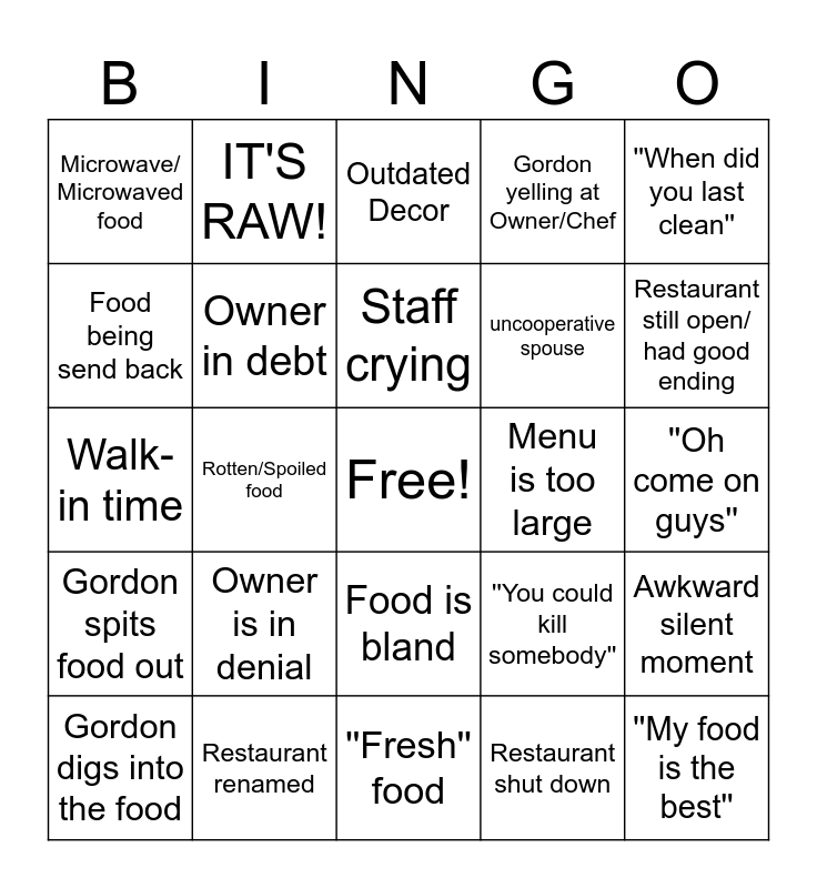 This bingo card has a free space and 29 words: Gordon digs into the food, Dirty Kitchen, Rotten/Spoiled food, Server being honest with Gordon, Microwave/ Microwaved food, Outdated Decor, Owner in debt, Owner is in denial, Menu is too large, Restaurant renamed, ''Oh come on guys'', ''My food is the best'', ''Fresh'' food, Restaurant shut down, Restaurant still open/ had good ending, Greasy food, Food is bland, Gordon spits food out, ''When did you last clean'', Walk-in time, ''You could kill somebody'', Gordon shuts down restaurant, uncooperative spouse, Food being send back, Gordon yelling at Owner/Chef, IT'S RAW!, Awkward silent moment, Staff crying and Gordon likes the food.