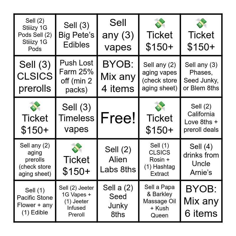 This bingo card has a free space and 24 words: 💸 Ticket $150+, Sell (2) Jeeter 1G Vapes + (1) Jeeter Infused Preroll, BYOB: Mix any 4 items, Sell (1) Pacific Stone Flower + any (1) Edible, 💸 Ticket $150+, Sell (2) Stiiizy 1G Pods Sell (2) Stiiizy 1G Pods, Sell (3) CLSICS prerolls, Sell (3) Big Pete’s Edibles, 💸 Ticket $150+, Sell (2) Alien Labs 8ths, Sell any (2) aging vapes (check store aging sheet), 💸 Ticket $150+, Sell (1) CLSICS Rosin + (1) Hashtag Extract, Sell (4) drinks from Uncle Arnie’s, Push Lost Farm 25% off (min 2 packs), Sell a Papa & Barkley Massage Oil + Kush Queen, Sell (2) California Love 8ths + preroll deals, Sell any (3) vapes, Sell any (3) Phases, Seed Junky, or Blem 8ths, Sell (3) Timeless vapes, BYOB: Mix any 6 items, Sell any (2) aging prerolls (check store aging sheet), 💸 Ticket $150+ and Sell a (2) Seed Junky 8ths.