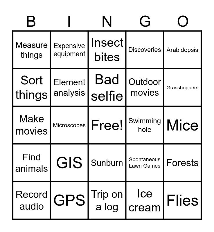 This bingo card has a free space and 49 words: Study tiny things, Improvise equipment, Ticks, Ice cream, Mice, Study large things, Expensive equipment, Accidental bacteria growth, Outdoor movies, Frogs, Sort things, Microscopes, Spontaneous Lawn Games, Flies, Intentional bacteria growth, Binoculars, Insect bites, Swimming hole, Red efts, Measure things, GPS, Trip on a log, Discoveries, Arabidopsis, Breed animals, GIS, Bad selfie, Mini golf, Forests, Find animals, Cameras, Sunburn, Eureka moment!, Leeches, Record audio, Genotyping, No snack, Epic hike, Grasshoppers, Run gels, Coding, Power outage, Epic nap, Cell lines, Make movies, Element analysis, Too darn hot, BBQ and Birds.