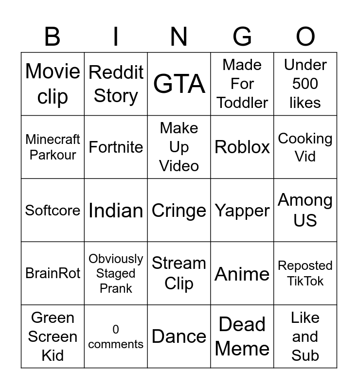 This bingo card has a free space and 24 words: Obviously Staged Prank, 0 comments, Make Up Video, Green Screen Kid, Under 500 likes, Movie clip, Minecraft Parkour, Reddit Story, Yapper, Stream Clip, Roblox, Softcore, Anime, Reposted TikTok, Fortnite, Dead Meme, Among US, GTA, Cooking Vid, Indian, Like and Sub, BrainRot, Made For Toddler and Dance.