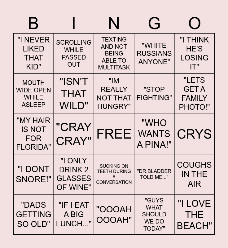 This bingo card has a free space and 24 words: "I ONLY DRINK 2 GLASSES OF WINE", "IF I EAT A BIG LUNCH...", "IM REALLY NOT THAT HUNGRY", "DADS GETTING SO OLD", "I THINK HE'S LOSING IT", "I NEVER LIKED THAT KID", MOUTH WIDE OPEN WHILE ASLEEP, SCROLLING WHILE PASSED OUT, "WHO WANTS A PINA!", SUCKING ON TEETH DURING A CONVERSATION, "STOP FIGHTING", "MY HAIR IS NOT FOR FLORIDA", "DR.BLADDER TOLD ME...", COUGHS IN THE AIR, "ISN'T THAT WILD", "GUYS WHAT SHOULD WE DO TODAY", CRYS, TEXTING AND NOT BEING ABLE TO MULTITASK, "LETS GET A FAMILY PHOTO!", "CRAY CRAY", "I LOVE THE BEACH", "I DONT SNORE!", "WHITE RUSSIANS ANYONE" and "OOOAH OOOAH".