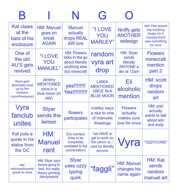 This bingo card has 36 words: “we HAVE to get to work on the canon rp..” said by literally anyone, Eric mention (Has to be completely unrelated to the conversation), “faggli”, One of the old AU’S gets revived, Vyra fanclub unites, LAMIA MENTIONED ONCE IN A BLUE MOON, “I LOVE YOU MANUEL”, Styar uses ozzy typing quirk, Nniffy gets ANOTHER redesign, Vyra, Flowers minecraft mention part 2, “I LOVE YOU MARLEY”, “OZZYCORE”, Jeremy MENTIONED once in a blue moon (in AW), random vyra art drop, Kat claws at the bars of his enclosure, Kat puts a quote in his status from the GC, Eli alcoholic mention, Ruse gets absolutely beat up by the lesbians (vyra/freespace), Manuel actually drops REAL AW lore, yes!!!!!!!! Yes!!!!!!!!!!, Styar sends the lemon, marley says a slur to one of manuels drawings, flowers participates, Flowers actually makes vyra lore for once, HM: Manuel goes on break AGAIN, HM: Styar sends literally ANYONE a dm at 12am, HM: Styar says theyre going to bed, but really theyre grinding dandysworld, HM: Flowers talks in the gc about literally anything else but minecraft, HM: Pixii doesnt say anything freaky for 5 minutes/Scott says something for once, HM: Kat sends random manuel art, HM: milo/cassie/pamic speak for once, HM: pixii actually wants to talk about eric and andy, HM: scott drops random art, HM: Manuel rant and HM: Manuel changes his name again.