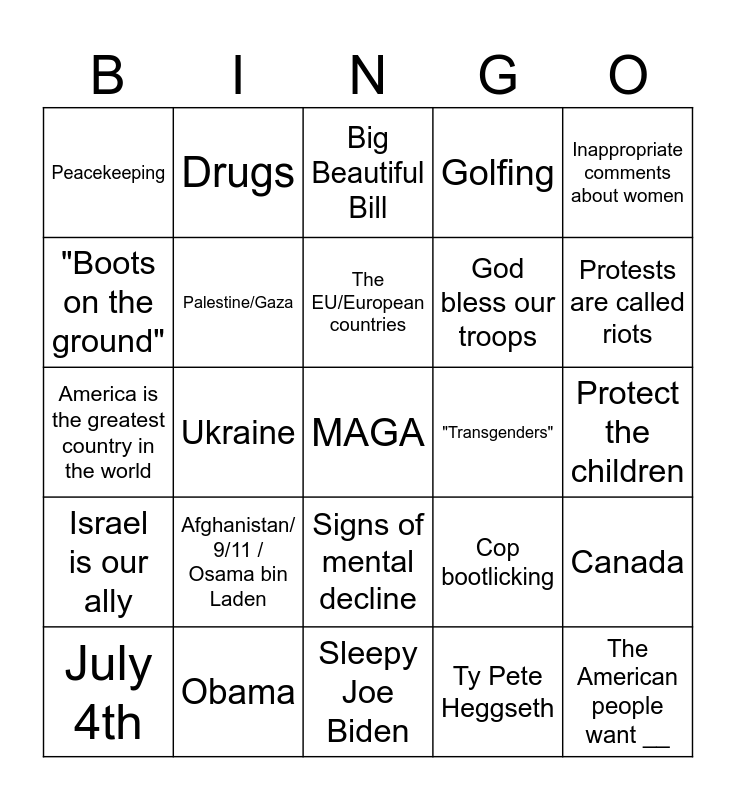 This bingo card has a free space and 29 words: July 4th, "Illegals", Ukraine, Russia/Putin, Peacekeeping, Big Beautiful Bill, Palestine/Gaza, Afghanistan/ 9/11 / Osama bin Laden, "Transgenders", Obama, Protect the children, The American people want __, Sleepy Joe Biden, Ty Pete Heggseth, Protests are called riots, Elon Musk, Signs of mental decline, Israel is our ally, Inappropriate comments about women, America is the greatest country in the world, Cop bootlicking, "We're under attack", God bless our troops, "Boots on the ground", Golfing, Drugs, Canada, The EU/European countries and Birthday parade.