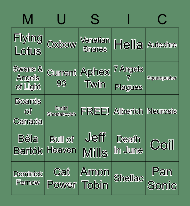 This bingo card has a free space and 24 words: Bull of Heaven, Cat Power, Aphex Twin, Dominick Fernow, Autechre, Flying Lotus, Swans & Angels of Light, Oxbow, Alberich, Jeff Mills, 7 Angels 7 Plagues, Boards of Canada, Death in June, Coil, Current 93, Shellac, Neurosis, Venetian Snares, Squarepusher, Dmitri Shostakovich, Pan Sonic, Béla Bartók, Hella and Amon Tobin.