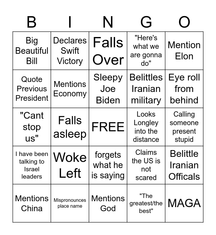 This bingo card has a free space and 39 words: leap of logic, Denies we are at war, Praises Himself, Mentions Economy, Mentions China, forgets what he is saying, Sleepy Joe Biden, Fake News, Mention Elon, I have been talking to Israel leaders, Falls asleep, "Here's what we are gonna do", MAGA, Calling someone present stupid, Looks Longley into the distance, Woke Left, Plans to Deploy solders, Big Beautiful Bill, Budget, Claims the US is not scared, Quote Previous President, Mentions God, Belittles Iranian military, Eye roll from behind, Praises Military, Refuses Questions, "Peace in the middle east", Annoyed Background person, Unrealistic Timeline, Declares Swift Victory, Incoherent, Hand Gestures, Falls Over, Mispronounces place name, "The greatest/the best", Mentions Obama, Belittle Iranian Officals, "Cant stop us" and "America First".