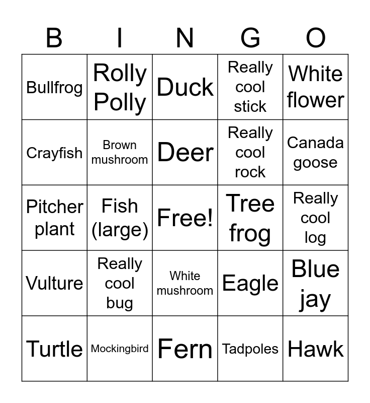 This bingo card has a free space and 35 words: Northern Cardinal, Salamander, Red mushroom, Brown mushroom, White mushroom, Really cool stick, Crayfish, Toad, Deer, Beaver-chewed tree, Pitcher plant, White flower, Blue flower, Fish, Bullfrog, Tree frog, Tadpoles, Fish (large), Vulture, Hawk, Eagle, Turtle, Blue jay, Mockingbird, Duck, Canada goose, Heron, Egret, Really cool rock, Really cool log, Moss, Fern, Really cool bug, Rolly Polly and Really cool mushroom.