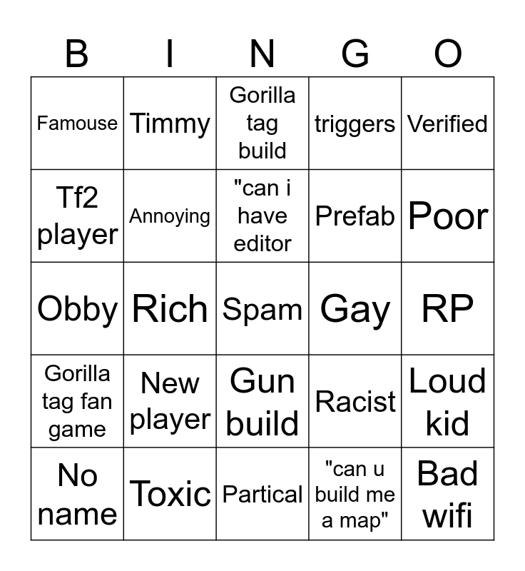 This bingo card has a free space and 24 words: New player, Toxic, "can i have editor, No name, Verified, Famouse, Tf2 player, Timmy, Gay, Gun build, Prefab, Obby, Racist, Loud kid, Annoying, "can u build me a map", RP, Gorilla tag build, Poor, Rich, Bad wifi, Gorilla tag fan game, triggers and Partical.