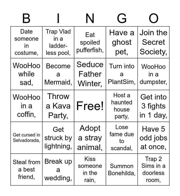 This bingo card has a free space and 24 words: Get struck by lightning,, Break up a wedding,, Seduce Father Winter,, Steal from a best friend,, Join the Secret Society,, Date someone in costume,, WooHoo while sad,, Trap Vlad in a ladder-less pool,, Host a haunted house party,, Adopt a stray animal,, Turn into a PlantSim,, WooHoo in a coffin,, Lose fame due to scandal,, Have 5 odd jobs at once,, Become a Mermaid,, Summon Bonehilda,, Get into 3 fights in 1 day,, Eat spoiled pufferfish,, WooHoo in a dumpster,, Throw a Kava Party,, Trap 2 Sims in a doorless room,, Get cursed in Selvadorada,, Have a ghost pet, and Kiss someone in the rain,.