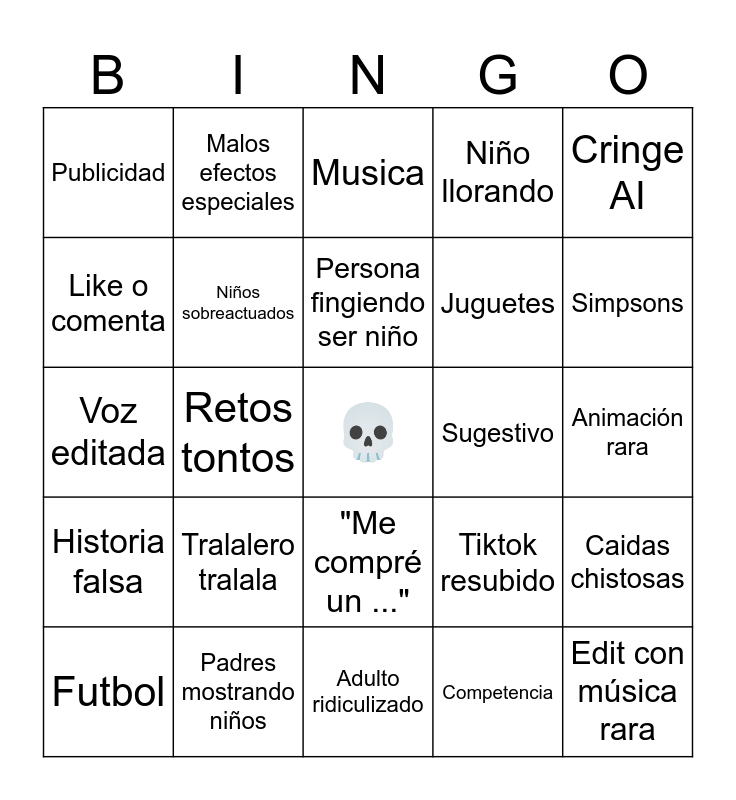 This bingo card has a free space and 24 words: Tralalero tralala, Padres mostrando niños, Persona fingiendo ser niño, Futbol, Cringe AI, Publicidad, Like o comenta, Malos efectos especiales, Sugestivo, "Me compré un ...", Juguetes, Voz editada, Tiktok resubido, Caidas chistosas, Niños sobreactuados, Competencia, Animación rara, Musica, Simpsons, Retos tontos, Edit con música rara, Historia falsa, Niño llorando and Adulto ridiculizado.