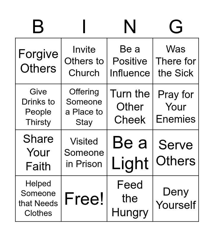 This bingo card has 16 words: Free!, Serve Others, Be a Positive Influence, Forgive Others, Share Your Faith, Invite Others to Church, Be a Light, Feed the Hungry, Give Drinks to People Thirsty, Offering Someone a Place to Stay, Helped Someone that Needs Clothes, Was There for the Sick, Visited Someone in Prison, Pray for Your Enemies, Turn the Other Cheek and Deny Yourself.