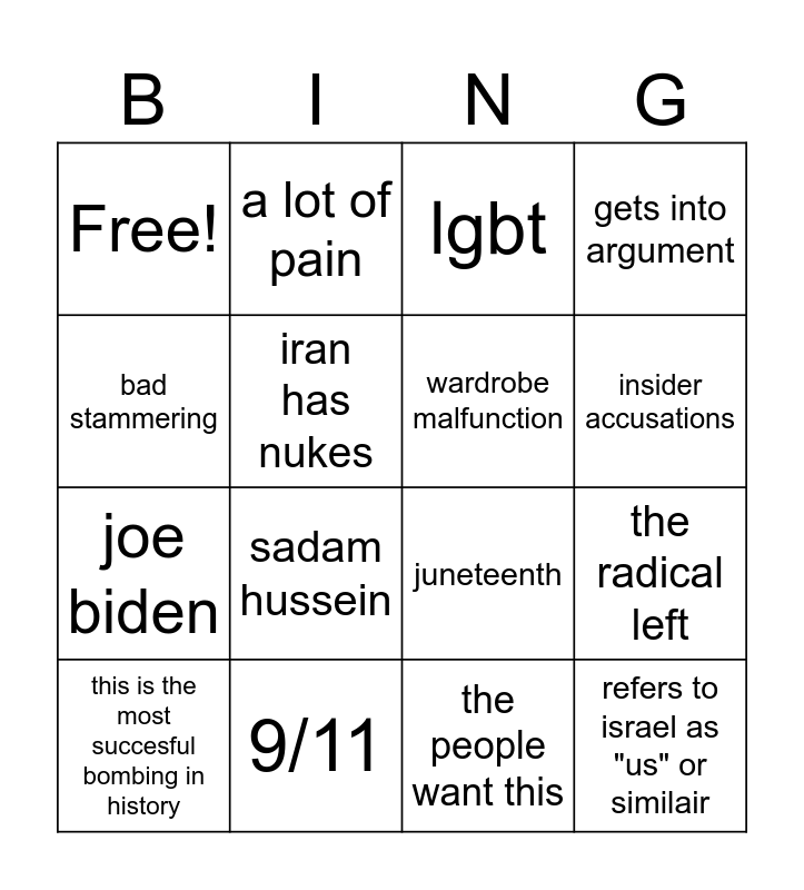 This bingo card has 16 words: this is the most succesful bombing in history, 9/11, lgbt, gets into argument, bad stammering, a lot of pain, juneteenth, the radical left, Free!, iran has nukes, the people want this, insider accusations, joe biden, sadam hussein, wardrobe malfunction and refers to israel as "us" or similair.