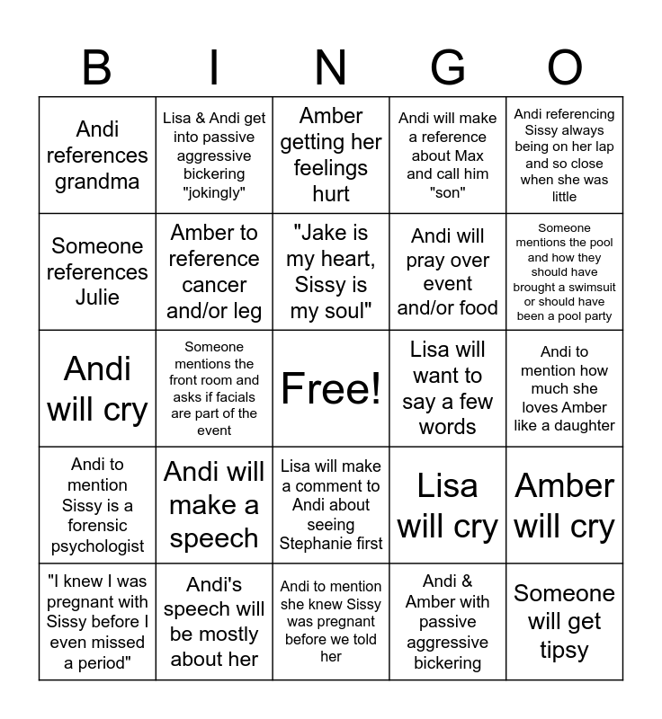 This bingo card has a free space and 24 words: Andi will make a speech, Andi's speech will be mostly about her, "Jake is my heart, Sissy is my soul", "I knew I was pregnant with Sissy before I even missed a period", Andi referencing Sissy always being on her lap and so close when she was little, Andi references grandma, Someone references Julie, Lisa & Andi get into passive aggressive bickering "jokingly", Lisa will want to say a few words, Lisa will make a comment to Andi about seeing Stephanie first, Andi will pray over event and/or food, Andi will cry, Lisa will cry, Amber will cry, Amber to reference cancer and/or leg, Andi & Amber with passive aggressive bickering, Andi to mention how much she loves Amber like a daughter, Amber getting her feelings hurt, Someone mentions the pool and how they should have brought a swimsuit or should have been a pool party, Someone mentions the front room and asks if facials are part of the event, Someone will get tipsy, Andi to mention Sissy is a forensic psychologist, Andi will make a reference about Max and call him "son" and Andi to mention she knew Sissy was pregnant before we told her.