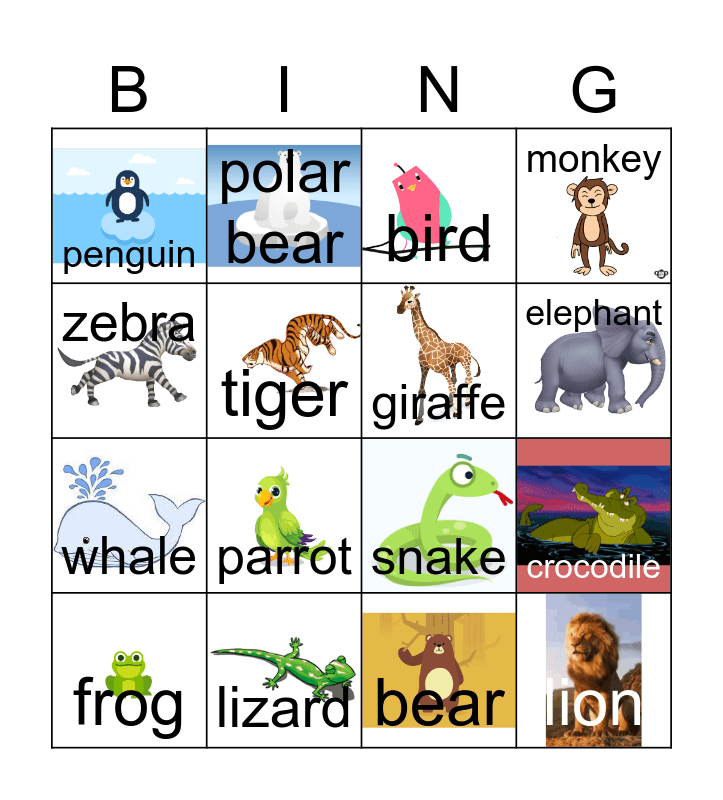 This bingo card has 16 images and 16 words: lizard, crocodile, bird, penguin, whale, polar bear, snake, bear, zebra, tiger, frog, monkey, parrot, elephant, giraffe and lion.