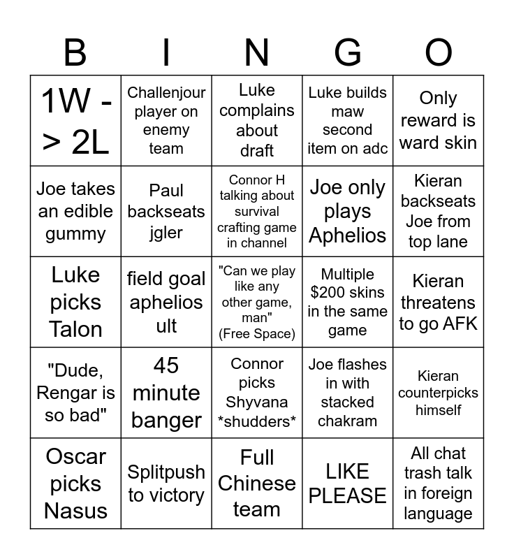 This bingo card has a free space and 24 words: 45 minute banger, Splitpush to victory, Connor H talking about survival crafting game in channel, Oscar picks Nasus, Only reward is ward skin, 1W -> 2L, Joe takes an edible gummy, Challenjour player on enemy team, Multiple $200 skins in the same game, Connor picks Shyvana *shudders*, Joe only plays Aphelios, Luke picks Talon, Joe flashes in with stacked chakram, Kieran counterpicks himself, Paul backseats jgler, LIKE PLEASE, Kieran threatens to go AFK, Luke complains about draft, Kieran backseats Joe from top lane, field goal aphelios ult, All chat trash talk in foreign language, "Dude, Rengar is so bad", Luke builds maw second item on adc and Full Chinese team.