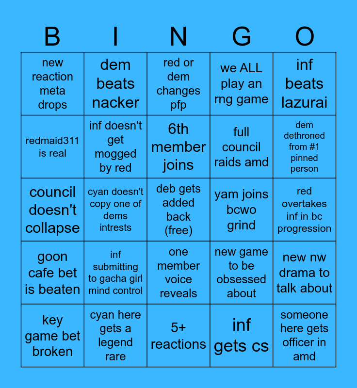 This bingo card has a free space and 24 words: inf submitting to gacha girl mind control, cyan here gets a legend rare, 6th member joins, key game bet broken, inf beats lazurai, new reaction meta drops, redmaid311 is real, dem beats nacker, yam joins bcwo grind, one member voice reveals, full council raids amd, council doesn't collapse, new game to be obsessed about, new nw drama to talk about, inf doesn't get mogged by red, inf gets cs, red overtakes inf in bc progression, red or dem changes pfp, dem dethroned from #1 pinned person, cyan doesn't copy one of dems intrests, someone here gets officer in amd, goon cafe bet is beaten, we ALL play an rng game and 5+ reactions.