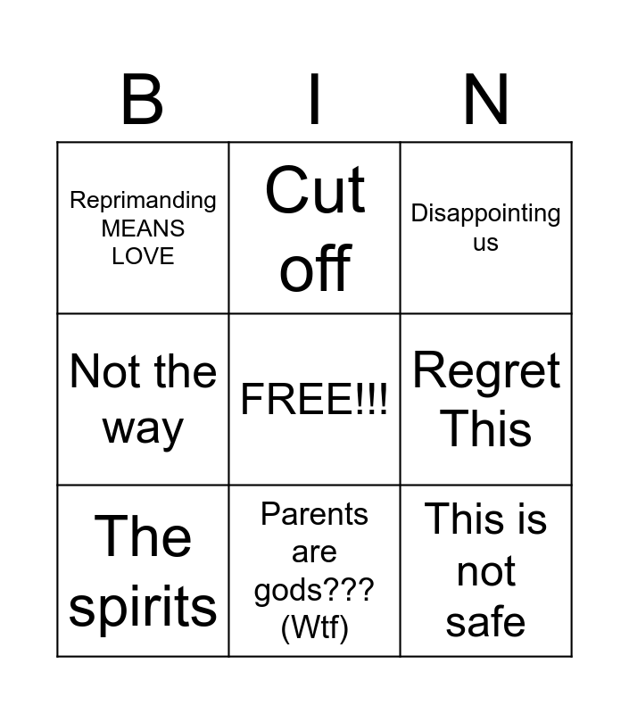 This bingo card has a free space and 8 words: Regret This, Disappointing us, Cut off, The spirits, Reprimanding MEANS LOVE, This is not safe, Not the way and Parents are gods??? (Wtf).