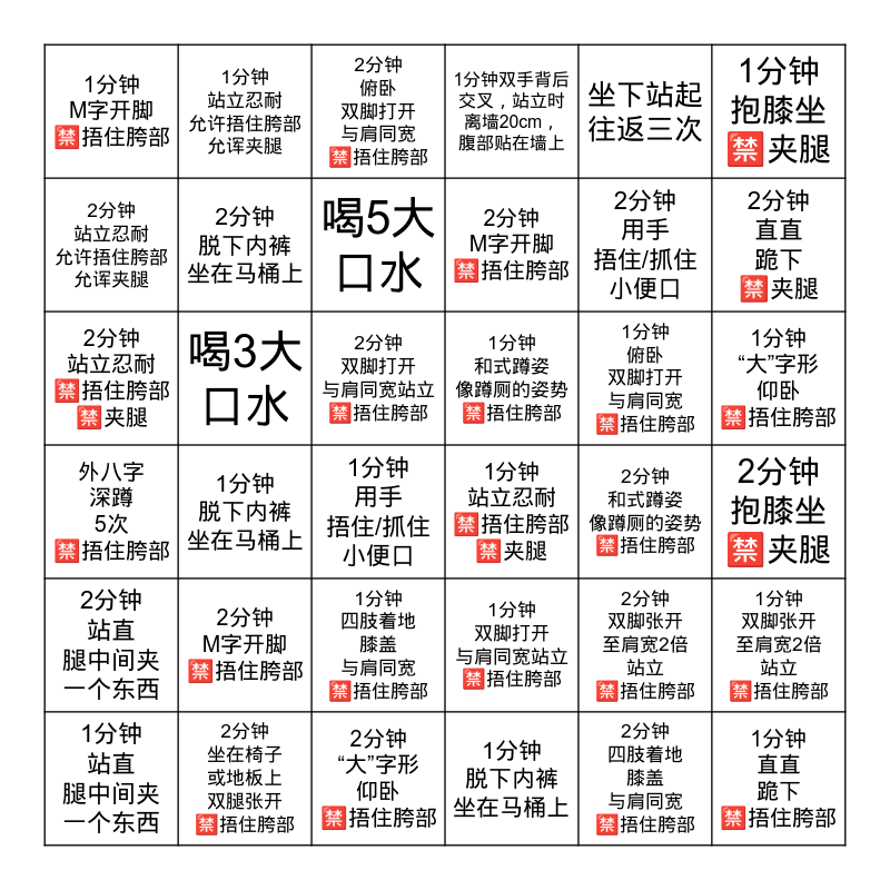 This bingo card has 36 words: 1分钟 双脚打开 与肩同宽站立 🈲捂住胯部, 1分钟 四肢着地 膝盖 与肩同宽 🈲捂住胯部, 1分钟 脱下内裤 坐在马桶上, 2分钟 站立忍耐 允许捂住胯部 允诨夹腿, 外八字 深蹲 5次 🈲捂住胯部, 1分钟 和式蹲姿 像蹲厕的姿势 🈲捂住胯部, 2分钟 脱下内裤 坐在马桶上, 2分钟 “大”字形 仰卧 🈲捂住胯部, 坐下站起 往返三次, 2分钟 双脚张开 至肩宽2倍 站立 🈲捂住胯部, 2分钟 直直 跪下 🈲夹腿, 1分钟双手背后交叉,站立时离墙20cm, 腹部贴在墙上, 1分钟 双脚张开 至肩宽2倍 站立 🈲捂住胯部, 喝3大口水, 2分钟 M字开脚 🈲捂住胯部, 1分钟 M字开脚 🈲捂住胯部, 2分钟 站直 腿中间夹 一个东西, 1分钟 俯卧 双脚打开 与肩同宽 🈲捂住胯部, 2分钟 站立忍耐 🈲捂住胯部 🈲夹腿, 2分钟 俯卧 双脚打开 与肩同宽 🈲捂住胯部, 2分钟 双脚打开 与肩同宽站立 🈲捂住胯部, 1分钟 脱下内裤 坐在马桶上, 1分钟 站立忍耐 🈲捂住胯部 🈲夹腿, 1分钟 用手 捂住/抓住 小便口, 2分钟 和式蹲姿 像蹲厕的姿势 🈲捂住胯部, 1分钟 站立忍耐 允许捂住胯部 允诨夹腿, 2分钟 用手 捂住/抓住 小便口, 2分钟 坐在椅子 或地板上 双腿张开 🈲捂住胯部, 喝5大口水, 1分钟 抱膝坐 🈲夹腿, 1分钟 直直 跪下 🈲捂住胯部, 1分钟 站直 腿中间夹 一个东西, 2分钟 抱膝坐 🈲夹腿, 1分钟 “大”字形 仰卧 🈲捂住胯部, 2分钟 M字开脚 🈲捂住胯部 and 2分钟 四肢着地 膝盖 与肩同宽 🈲捂住胯部.