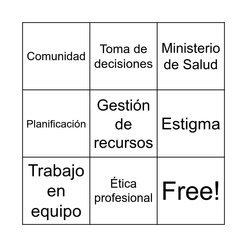 This bingo card has 11 words: Free!, Ética profesional, Gestión de recursos, Trabajo en equipo, Toma de decisiones, Ministerio de Salud, Estigma, Gato, Planificación, Comunidad and Liderazgo.