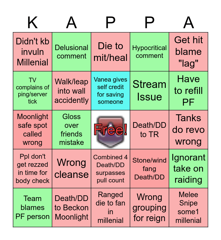 This bingo card has a free space and 29 words: Team blames PF person, TV/Keen invites Mik/MIzu, Gloss over friends mistake, 3/4 make a mistake in 1 pull, Didn't kb invuln Millenial, Die to mit/heal, Walk/leap into wall accidently, Wrong cleanse, Death/DD to TR, Death/DD to Beckon Moonlight, Tanks do revo wrong, Melee Snipe some1 millenial, Ranged die to fan in millenial, Wrong grouping for reign, Have to refill PF, No accountability claimed for wipe, Combined 4 Death/DD surpasses pull count, Ppl don't get rezzed in time for body check, Get hit blame "lag", Moonlight safe spot called wrong, Stone/wind fang Death/DD, Boring story from TV, Stream Issue, TV complains of ping/server tick, Hypocritical comment, Delusional comment, Ignorant take on raiding, Vanea gives self credit for saving someone and Vanea is in top 3 for mistakes.