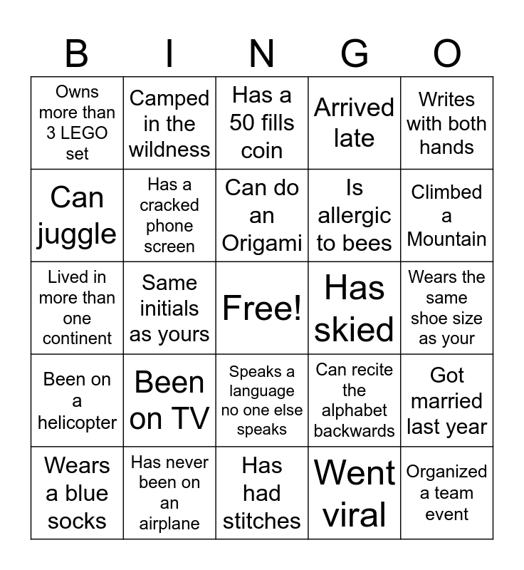 This bingo card has a free space and 24 words: Been on TV, Has never been on an airplane, Can do an Origami, Wears a blue socks, Writes with both hands, Owns more than 3 LEGO set, Can juggle, Camped in the wildness, Has skied, Speaks a language no one else speaks, Is allergic to bees, Lived in more than one continent, Can recite the alphabet backwards, Got married last year, Has a cracked phone screen, Went viral, Wears the same shoe size as your, Has a 50 fills coin, Climbed a Mountain, Same initials as yours, Organized a team event, Been on a helicopter, Arrived late and Has had stitches.