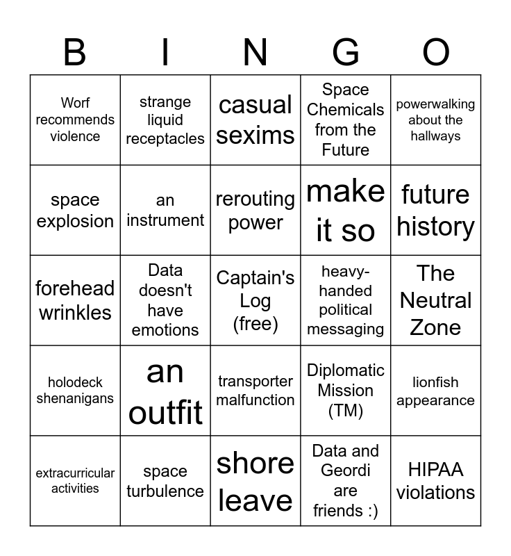 This bingo card has a free space and 24 words: an outfit, space turbulence, rerouting power, extracurricular activities, powerwalking about the hallways, Worf recommends violence, space explosion, strange liquid receptacles, heavy-handed political messaging, transporter malfunction, make it so, forehead wrinkles, Diplomatic Mission (TM), lionfish appearance, an instrument, Data and Geordi are friends :), The Neutral Zone, casual sexims, future history, Data doesn't have emotions, HIPAA violations, holodeck shenanigans, Space Chemicals from the Future and shore leave.