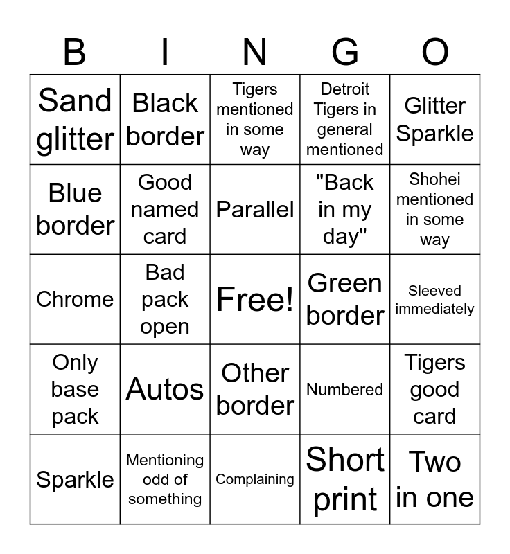 This bingo card has a free space and 24 words: Autos, Mentioning odd of something, Parallel, Sparkle, Glitter Sparkle, Sand glitter, Blue border, Black border, Green border, Other border, "Back in my day", Chrome, Numbered, Tigers good card, Good named card, Short print, Sleeved immediately, Tigers mentioned in some way, Shohei mentioned in some way, Bad pack open, Two in one, Only base pack, Detroit Tigers in general mentioned and Complaining.
