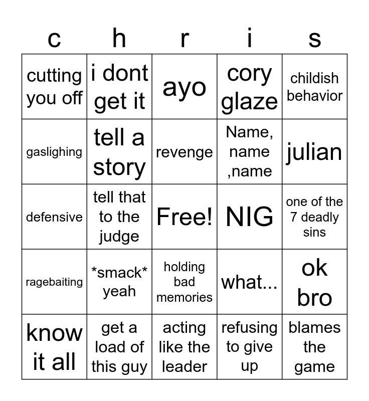 This bingo card has a free space and 24 words: *smack* yeah, get a load of this guy, revenge, know it all, childish behavior, cutting you off, gaslighing, i dont get it, NIG, holding bad memories, Name, name ,name, defensive, what..., ok bro, tell a story, refusing to give up, one of the 7 deadly sins, ayo, julian, tell that to the judge, blames the game, ragebaiting, cory glaze and acting like the leader.
