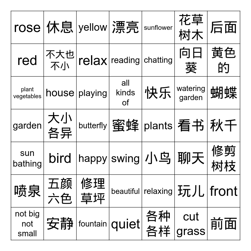 This bingo card has a free space and 62 words: 花园, garden, 房子, house, 前面, front, 后面, behind, 不大也不小, not big not small, 漂亮, beautiful, 花草树木, plants, 玫瑰花, rose, 向日葵, sunflower, 红色的, red, 黄色的, yellow, 蝴蝶, butterfly, bee, 小鸟, bird, 浇水, watering garden, 修剪树枝, cut tree branch, 修理草坪, cut grass, 种菜, plant vegetables, 休息, relaxing, 聊天, chatting, 看书, reading, 玩儿, playing, 放松, relax, 快乐, happy, 安静, quiet, 各种各样, all kinds of, 大小各异, all sizes of, 五颜六色, colorful, 秋千, swing, 喷泉, fountain, 晒太阳, sun bathing and FREE.