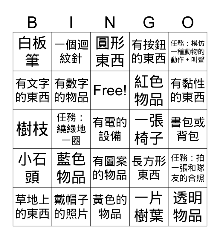 This bingo card has a free space and 24 words: 藍色物品, 戴帽子的照片, Free!, 草地上的東西, 任務:模仿一種動物的動作+叫聲, 白板筆, 有文字的東西, 一個迴紋針, 一張椅子, 有圖案的物品, 紅色物品, 樹枝, 長方形東西, 任務:拍一張和隊友的合照, 有數字的物品, 一片樹葉, 書包或背包, 圓形東西, 有黏性的東西, 任務:繞綠地一圈, 透明物品, 小石頭, 有按鈕的東西 and 黃色的物品.