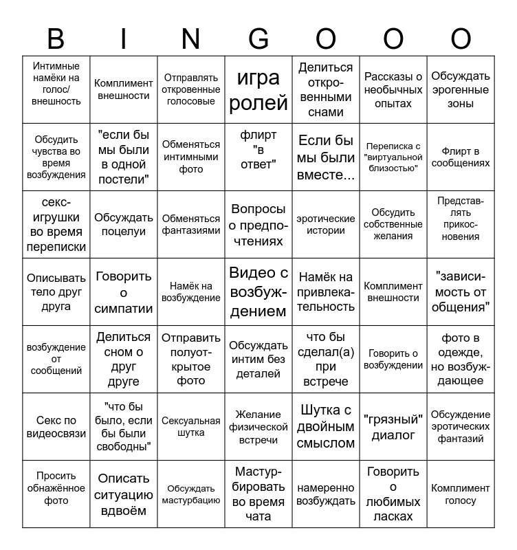 This bingo card has a free space and 48 words: Шутка с двойным смыслом, Переписка с "виртуальной близостью", Мастур- бировать во время чата, Говорить о симпатии, Обменяться фантазиями, "зависи-мость от общения", Комплимент внешности, Описать ситуацию вдвоём, Рассказы о необычных опытах, Обсуждать интим без деталей, Обсуждать эрогенные зоны, игра ролей, Обсудить собственные желания, эротические истории, Секс по видеосвязи, Комплимент внешности, Обсудить чувства во время возбуждения, Флирт в сообщениях, "грязный" диалог, Делиться откро- венными снами, Если бы мы были вместе..., Намёк на возбуждение, Интимные намёки на голос/внешность, "если бы мы были в одной постели", Обсуждение эротических фантазий, Обменяться интимными фото, Представ- лять прикос- новения, Просить обнажённое фото, Вопросы о предпо- чтениях, Обсуждать поцелуи, Говорить о любимых ласках, Намёк на привлека- тельность, фото в одежде, но возбуж- дающее, "что бы было, если бы были свободны", Описывать тело друг друга, что бы сделал(а) при встрече, Говорить о возбуждении, секс-игрушки во время переписки, Отправить полуот-крытое фото, Сексуальная шутка, возбуждение от сообщений, Комплимент голосу, Отправлять откровенные голосовые, Обсуждать мастурбацию, флирт "в ответ", Желание физической встречи, Делиться сном о друг друге and намеренно возбуждать.