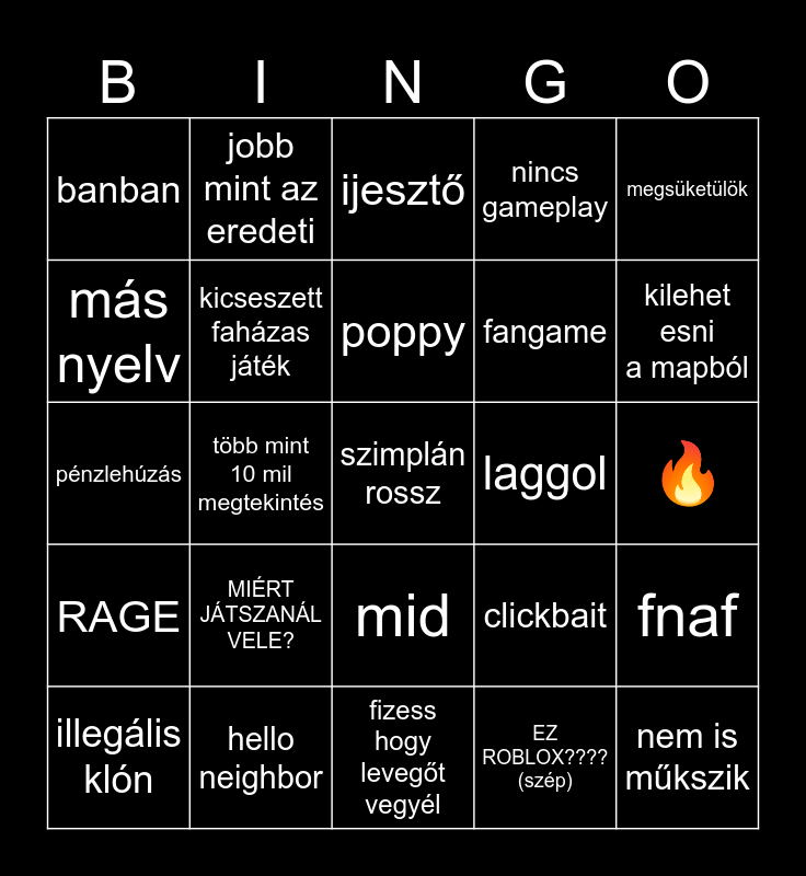 This bingo card has a free space and 24 words: illegális klón, MIÉRT JÁTSZANÁL VELE?, poppy, EZ ROBLOX???? (szép), megsüketülök, banban, jobb mint az eredeti, ijesztő, laggol, 🔥, pénzlehúzás, kicseszett faházas játék, clickbait, fnaf, más nyelv, hello neighbor, fizess hogy levegőt vegyél, nincs gameplay, kilehet esni a mapból, RAGE, több mint 10 mil megtekintés, mid, fangame and nem is műkszik.