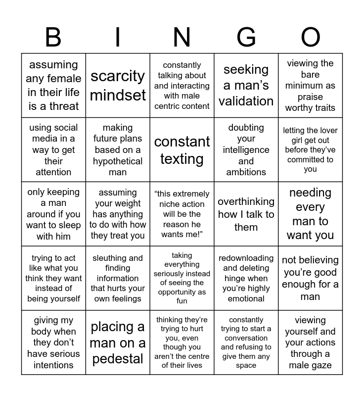 This bingo card has a free space and 24 words: sleuthing and finding information that hurts your own feelings, placing a man on a pedestal, constant texting, giving my body when they don’t have serious intentions, viewing the bare minimum as praise worthy traits, assuming any female in their life is a threat, using social media in a way to get their attention, scarcity mindset, overthinking how I talk to them, taking everything seriously instead of seeing the opportunity as fun, doubting your intelligence and ambitions, only keeping a man around if you want to sleep with him, redownloading and deleting hinge when you’re highly emotional, not believing you’re good enough for a man, making future plans based on a hypothetical man, constantly trying to start a conversation and refusing to give them any space, needing every man to want you, constantly talking about and interacting with male centric content, letting the lover girl get out before they’ve committed to you, assuming your weight has anything to do with how they treat you, viewing yourself and your actions through a male gaze, trying to act like what you think they want instead of being yourself, seeking a man’s validation and thinking they’re trying to hurt you, even though you aren’t the centre of their lives.