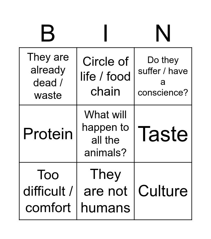 This bingo card has 9 words: Too difficult / comfort, Do they suffer / have a conscience?, Circle of life / food chain, Protein, They are already dead / waste, Taste, What will happen to all the animals?, Culture and They are not humans.