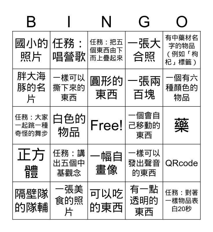 This bingo card has a free space and 24 words: 任務:講出五個中基觀念, 一張美食的照片, 圓形的東西, 隔壁隊的隊輔, 有中藥材名字的物品(例如「枸杞」標籤), 國小的照片, 胖大海豚的名片, 任務:唱營歌, 一個會自己移動的東西, 一幅自畫像, 一張兩百塊, 任務:大家一起跳一種奇怪的舞步, 一樣可以發出聲音的東西, QRcode, 一樣可以撕下來的東西, 有一點透明的東西, 藥, 任務:把五個東西由下而上疊起來, 一個有六種顏色的物品, 白色的物品, 任務:對著一樣物品表白20秒, 正方體, 一張大合照 and 可以吃的東西.