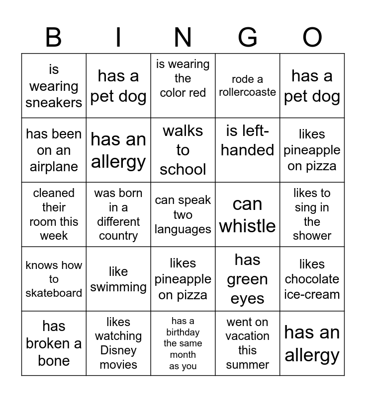 This bingo card has a free space and 24 words: like swimming, likes watching Disney movies, walks to school, has broken a bone, has a pet dog, is wearing sneakers, has been on an airplane, has a pet dog, can whistle, likes pineapple on pizza, is left-handed, cleaned their room this week, has green eyes, likes chocolate ice-cream, has an allergy, went on vacation this summer, likes to sing in the shower, is wearing the color red, likes pineapple on pizza, was born in a different country, has an allergy, knows how to skateboard, rode a rollercoaste and has a birthday the same month as you.