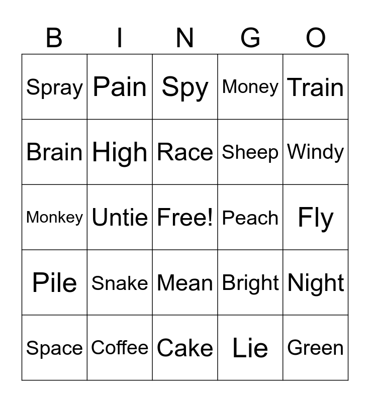 This bingo card has a free space and 25 words: Snake, Cake, Race, Space, Train, Spray, Brain, Pain, Peach, Mean, Sheep, Monkey, Bright, Night, High, Kite, Fly, Spy, Windy, Untie, Green, Coffee, Pile, Money and Lie.