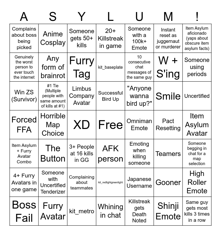 This bingo card has a free space and 48 words: Japanese Username, W + S'ing, Whining in chat, Horrible Map Choice, Limbus Company Avatar, Item Asylum Avatar, Anime Cosplay, Furry Avatar, Instant reset as juggernaut or murderer, AFK person, Item Asylum aficionado (yaps about obscure item asylum facts), 20+ Killstreak in game, Smile, "Anyone wanna bird up?", 4+ Furry Avatars in one game, Pact Resetting, Genuinely the worst person to ever touch the internet, Someone using periods, Gooner, Someone with a 100k+ Emote, 10 consecutive chat messages of the same guy, XD, Complains about boss being picked, Any form of brainrot, High Roller Emote, Furry Tag, Uncertified, Boss Fail, Successful Bird Up, #1 Tie (Multiple people with same amount of kills at #1), Shinji Emote, Omniman Emote, Someone begging in chat for a map selection, Someone with Uncertified Tenderizer, Forced FFA, Emoting when killing someone, Teamers, Win ZS (Survivor), 3+ People at 16 kills in GG, Complaining about teammates, Item Asylum + Furry Avatar Combo, Same guy gets most kills 3 times in a row, Someone gets 50+ kills, kit_metro, kit_baseplate, kit_redlightgreenlight, The Button and Killstreak gets Death Noted.