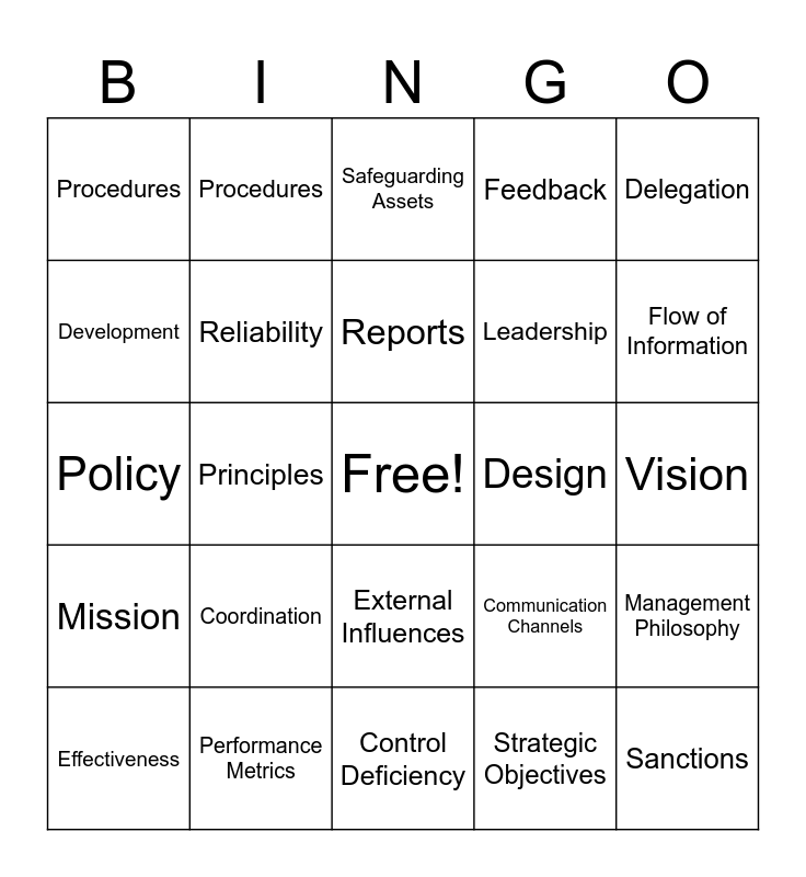This bingo card has a free space and 40 words: Framework, Principles, Components, Design, Implementation, Effectiveness, Reliability, Evaluation, Leadership, Management Philosophy, Policy, Procedures, Strategic Objectives, Vision, Mission, Coordination, Direction, Feedback, Decision-making, Procedures, Performance Metrics, Reports, Communication Channels, Flow of Information, Timeliness, Obsolescence, Control Deficiency, Uncertainty, Mitigation, Risk Factors, Business Process, Safeguarding Assets, Training, Sanctions, Development, Audit Committee, External Influences, Recruitment, Delegation and Competence.