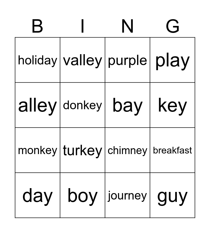 This bingo card has 16 words: boy, breakfast, purple, holiday, monkey, valley, chimney, journey, alley, donkey, day, play, turkey, key, bay and guy.