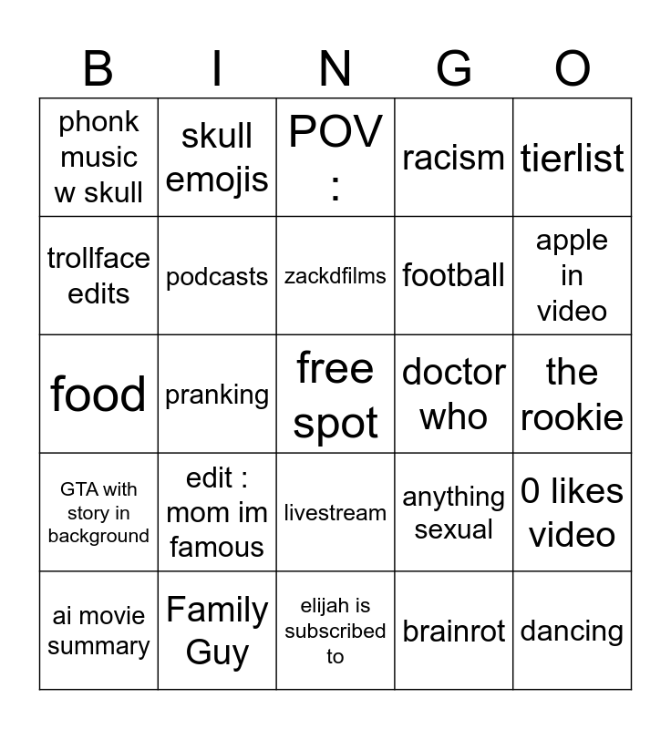 This bingo card has a free space and 24 words: edit : mom im famous, Family Guy, zackdfilms, ai movie summary, tierlist, phonk music w skull, trollface edits, skull emojis, doctor who, livestream, football, food, anything sexual, 0 likes video, podcasts, brainrot, the rookie, POV :, apple in video, pranking, dancing, GTA with story in background, racism and elijah is subscribed to.