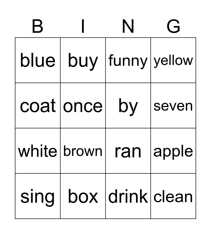 This bingo card has 16 words: box, apple, funny, blue, white, buy, ran, drink, coat, once, sing, yellow, brown, seven, by and clean.