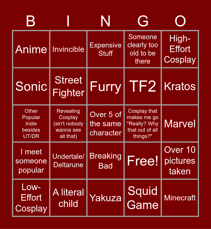 This bingo card has 25 words: Undertale/ Deltarune, Yakuza, Furry, Low-Effort Cosplay, High-Effort Cosplay, Anime, Sonic, Invincible, Cosplay that makes me go "Really? Why that out of all things?", Breaking Bad, TF2, Other Popular Indie besides UT/DR, Free!, Over 10 pictures taken, Street Fighter, Minecraft, Marvel, Expensive Stuff, Kratos, Revealing Cosplay (ain't nobody wanna see all that), Over 5 of the same character, A literal child, I meet someone popular, Someone clearly too old to be there and Squid Game.