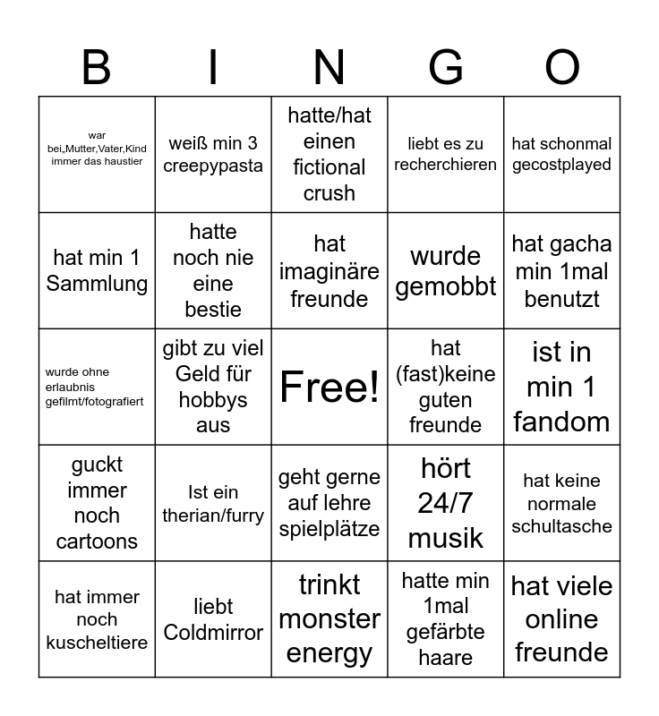 This bingo card has a free space and 24 words: Ist ein therian/furry, liebt Coldmirror, hat imaginäre freunde, hat immer noch kuscheltiere, hat schonmal gecostplayed, war bei„Mutter,Vater,Kind immer das haustier, hat min 1 Sammlung, weiß min 3 creepypasta, hat (fast)keine guten freunde, geht gerne auf lehre spielplätze, wurde gemobbt, wurde ohne erlaubnis gefilmt/fotografiert, hört 24/7 musik, hat keine normale schultasche, hatte noch nie eine bestie, hatte min 1mal gefärbte haare, ist in min 1 fandom, hatte/hat einen fictional crush, hat gacha min 1mal benutzt, gibt zu viel Geld für hobbys aus, hat viele online freunde, guckt immer noch cartoons, liebt es zu recherchieren and trinkt monster energy.